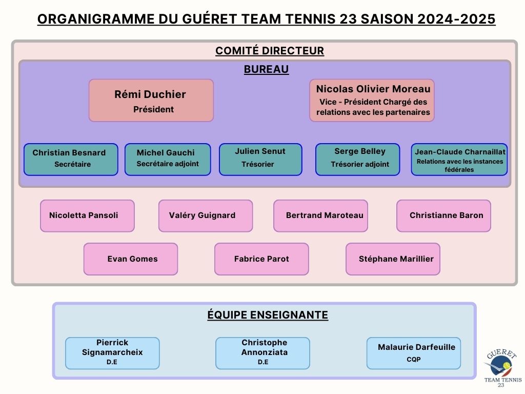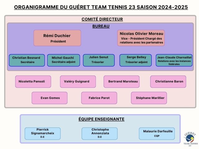 Organigramme du club Jeudi 5 décembre 2024, par Rémi DUCHIER Le bureau | | Recommander | Suite à l’Assemblée générale du 9 novembre 2024, le Guéret Team Tennis 23 a élu un nouveau comité directeur. Le bureau, quant à lui, demeure inchangé. Nous vous en présentons l’organigramme. Organigramme du Guéret Team Tennis 23